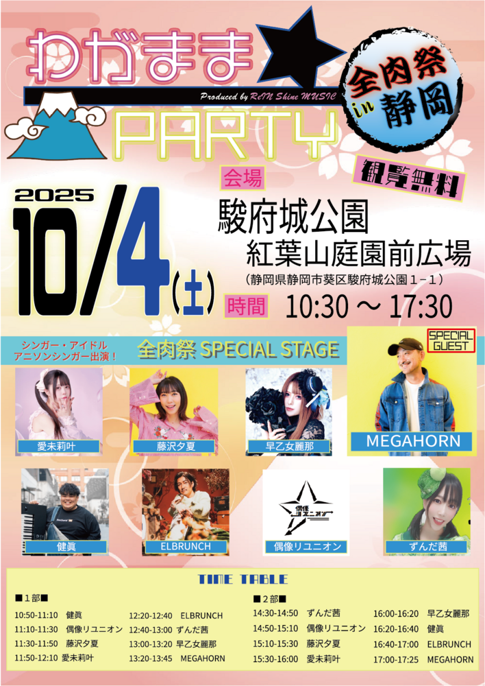 わがままPARTY×全肉祭 in 静岡 (フリーライブ) SCHEDULE 2025/10/04(土) 駿府城公園 紅葉山庭園前広場 フリーライブです。どなたでもご鑑賞いただけます。 URLをコピーする 報告する