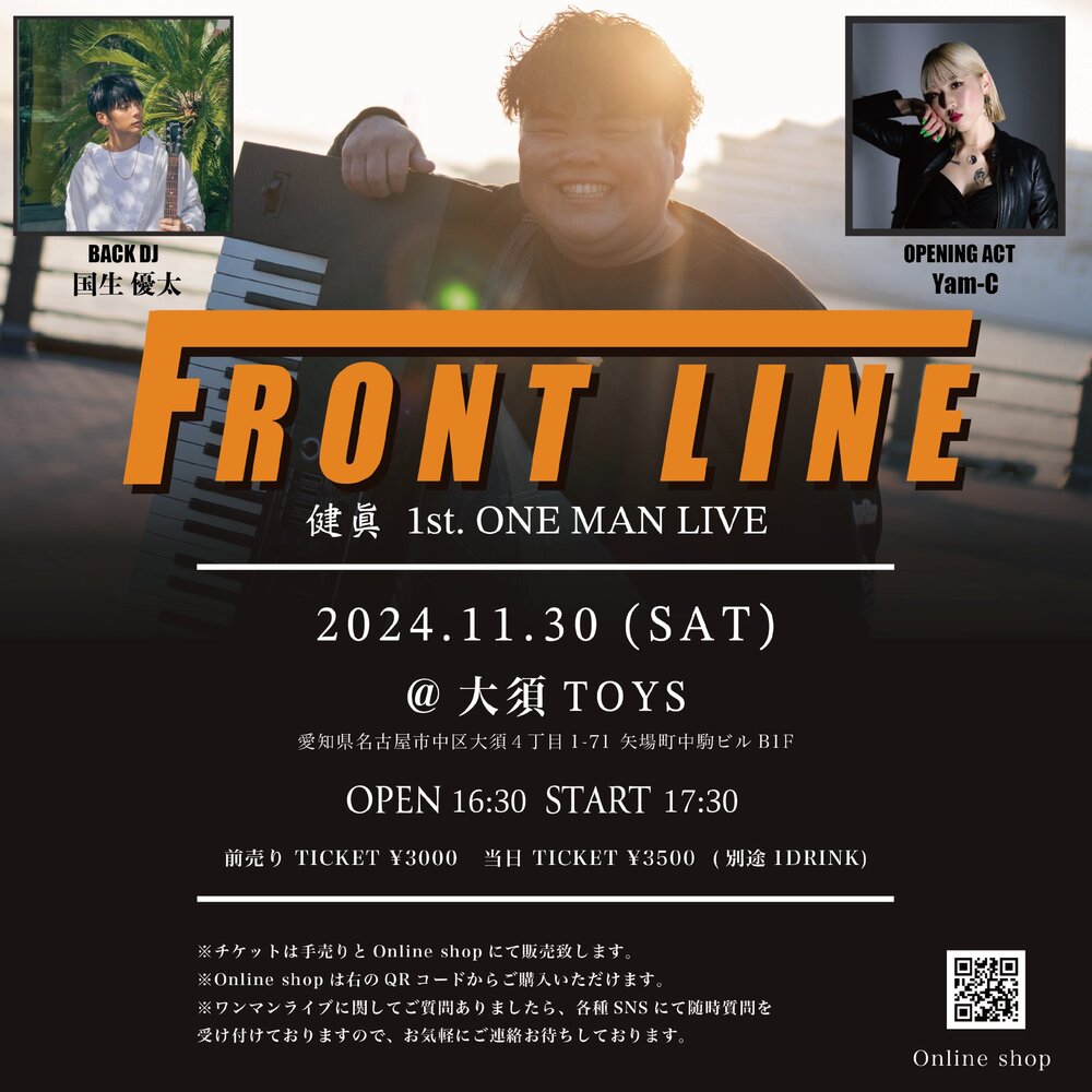 【LIVE】FLONT LINE 健眞 1st. ONE MAN LIVE SCHEDULE 2024/11/30(土) 大須 TOYS 健眞 / Opening Act : Yam-C / BACK DJ : 国生 優太 URLをコピーする 報告する